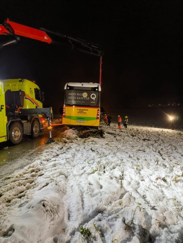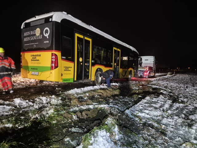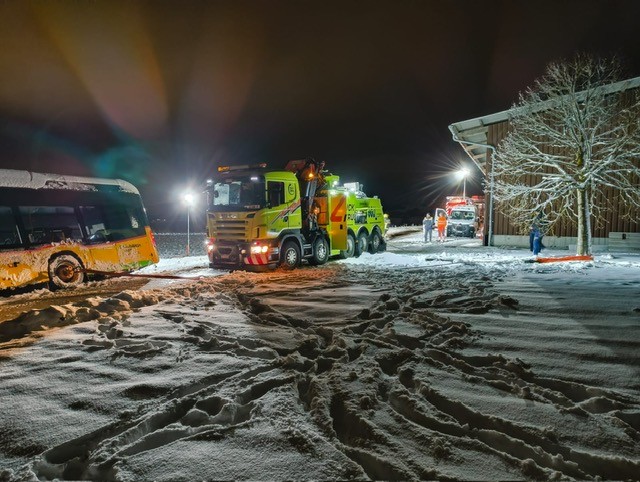 Aufgrund des intensiven Schneefalls rutschte auf der Höhe Scheune Sonnenhof ein Postauto von der Strasse und strandete im Graben. Die FW Knutwil-Mauensee wurde aufgeboten um die Strasse zu sichern und zu sperren, die Unfallstelle auszuleuchten sowie die Bergungsarbeiten zu unterstützen. Für die Bergung musste ein externes Unternehmen mit schwerem Gerät aufgeboten werden sowie zusätzlich ein Traktor eines eines anwesenden AdF’s. Da sich die Bergung und das zurückstellen auf die Strasse herausfordernd gestaltete, dauerte die gesamte Aktion fast 6 Stunden. Verletzt wurde niemand, der Bus kam mit ein paar Kratzern davon und konnte die Heimfahrt auf eigenen Rädern fortsetzen. Im Einsatz standen 6 AdF’s der FW, ein externes Abschleppunternehmen sowie ein Patrouille der Polizei.