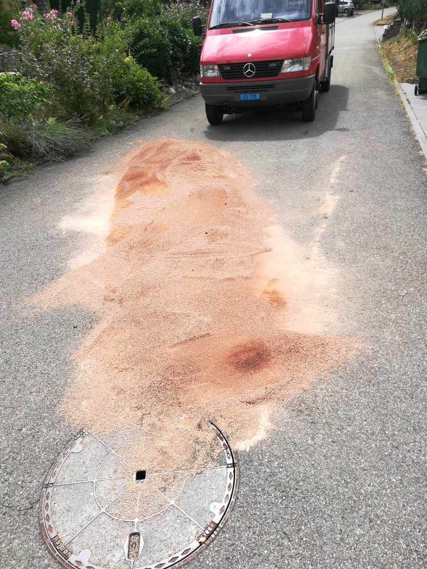 Am 09.08.2018 hatte ein Hubstapler in St. Erhard ein Hydrauliköl leck. Unsere Feuerwehr beseitigte das Öl mittels Bindemittel.