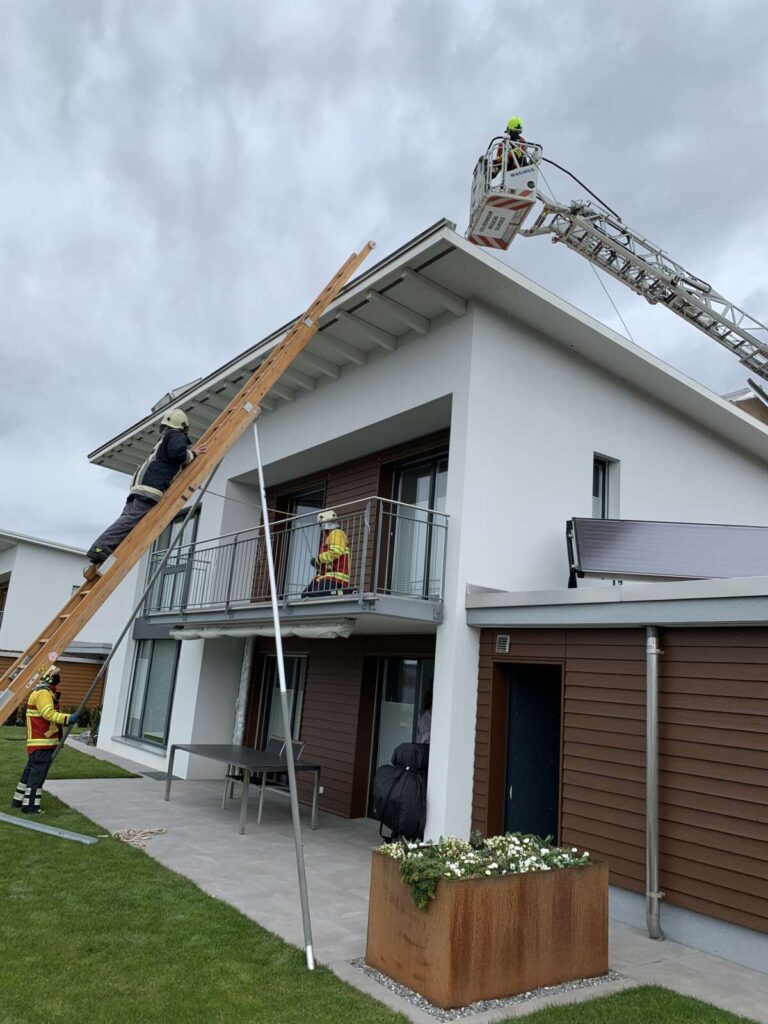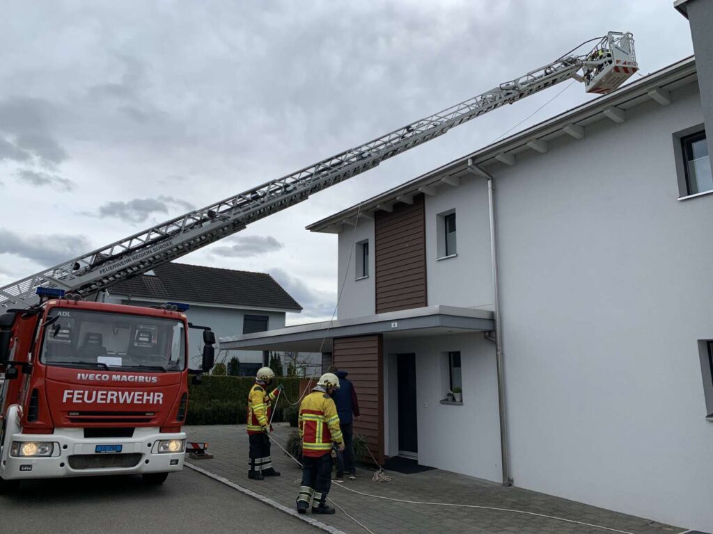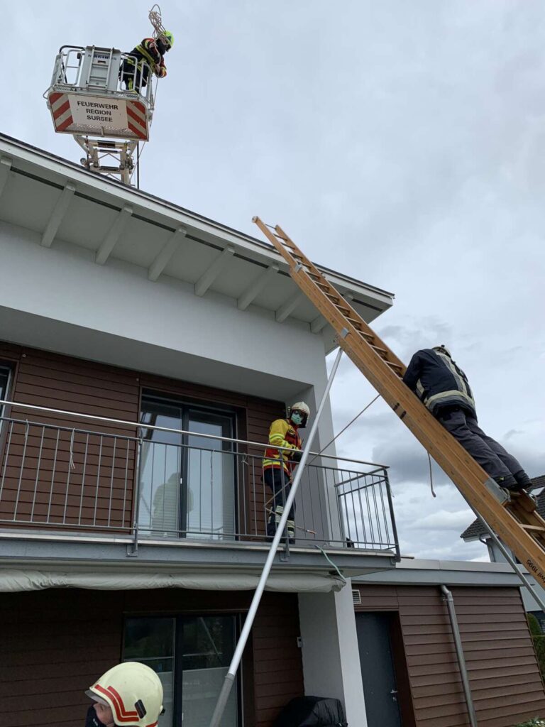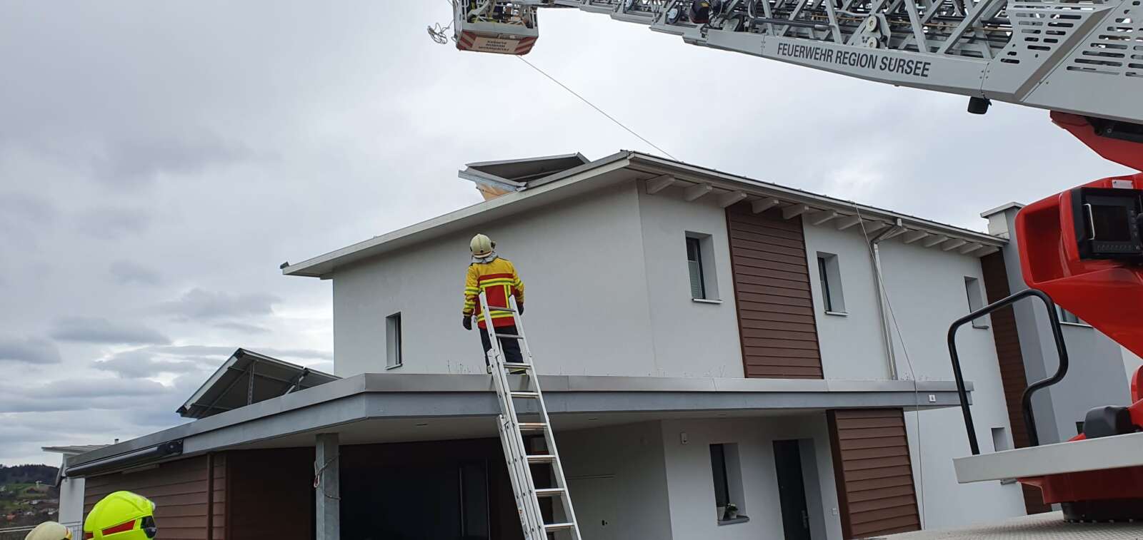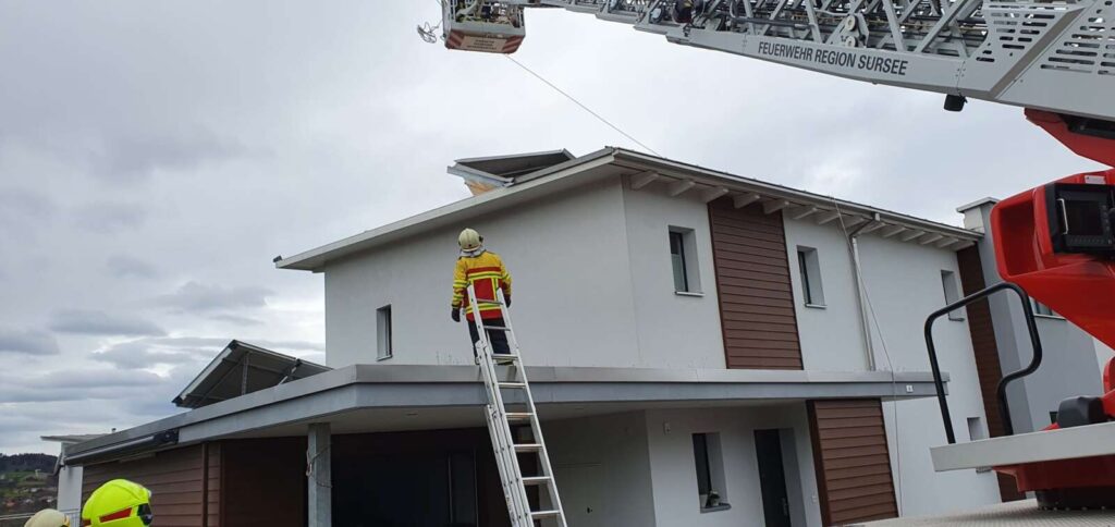Um 12.48 Uhr wurde die Feuerwehr Knutwil Mauensee zu einer technischen Hilfeleistung in das Chottenrain-Quartier in Mauensee aufgeboten. Beschädigung eines Pultdaches durch Sturmböhen. Beim Eintreffen war bereits ein Teil des Blechdaches wie Papier aufgefaltet. Das Gefahrenpotential war gross, dass der Rest der Konstruktion weiteren Böhen nicht mehr standhielt und „wegzufliegen“ drohte. Solange die losen Teile nicht gesichert waren, durfte aus Sicherheitsgründen niemand das Dach betreten. Dafür wurde zusätzlich die ADL aus Sursee aufgeboten, um die Teile mit Seilen, welche quer über das ganze Haus gespannt wurden, zu sichern. Erst danach konnte das Dach betreten und das lose Dachteil entsprechend gesichert werden.